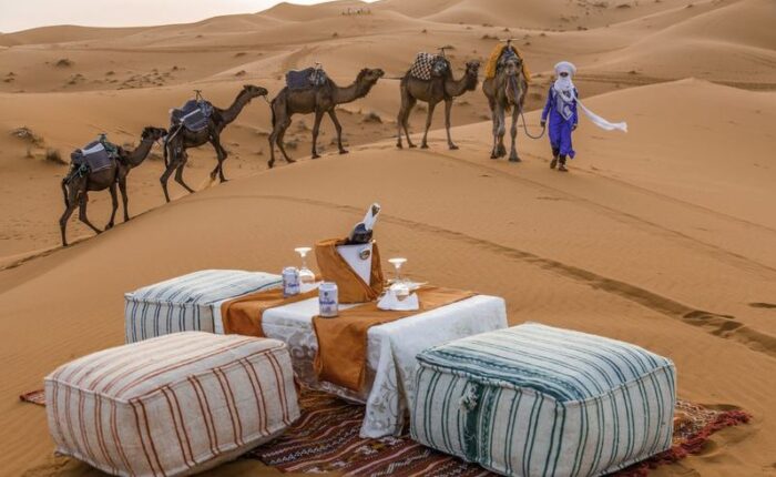 Visita del villaggio di MERZOUGA e territorio desertico circostante. Breve sosta al piccolo villaggio di KHAMLIA, noto nella regione per la presenza di un famoso gruppo di suonatori di musica gnawa, originari dall’Africa nera. Proseguendo attraverso le piste di sabbia raggiungeremo l’ hammada, chiamata anche  deserto nero, di origine vulcanica, ricco di pietre fossili a testimonianza delle antiche origini di questo territorio. Sosta al villaggio di TISSRDMIN per una rilassante passeggiate tra le palme, località dove spesso vengono girati film ambientati sul deserto. Nel tardo pomeriggio partenza con la carovana a dorso di dromedario della durata di circa un’ora per raggiungere il bivacco di tende berbere immerso tra le dune dorate dell’ERG CHEBBI. Si potrà ammirare il tramonto del sole tra le dune. Cena tipica ed intrattenimento con musica locale. Pernottamento in accampamento tendato.